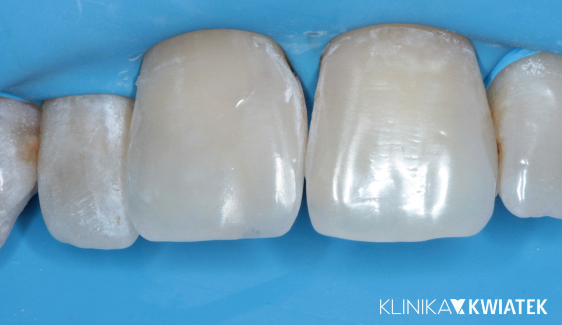 Pacjent rozpoczął leczenie od profesjonalnej higienizacji i szczegółowego badania stomatologicznego, które ujawniło konieczność leczenia zachowawczego. Wykonano estetyczne wypełnienia kompozytowe w powiększeniu (mikroskop) i z użyciem koferdamu, uzyskując naturalny efekt i harmonijny kształt zębów. Regularne wizyty higienizacyjne i kontrolne będą kluczowe, by utrzymać zdrowy uśmiech przez lata.