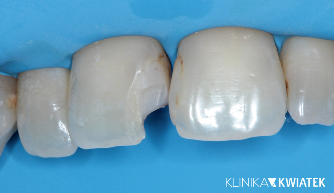 Pacjentka doznała urazu i zgłosiła się do naszej kliniki z problemem uszkodzonej korony prawej górnej jedynki. W trakcie leczenia wykonano znieczulenie, opracowanie ubytku i kompleksową rekonstrukcję nanokompozytem na kilku powierzchniach. Efekt końcowy to naturalny wygląd i pełna funkcja odbudowanego zęba, przywracająca Pacjentce komfort i odzyskanie uśmiechu.
