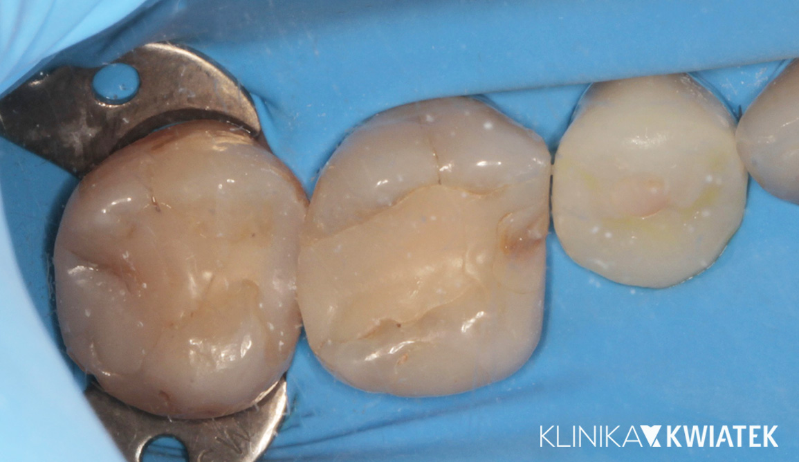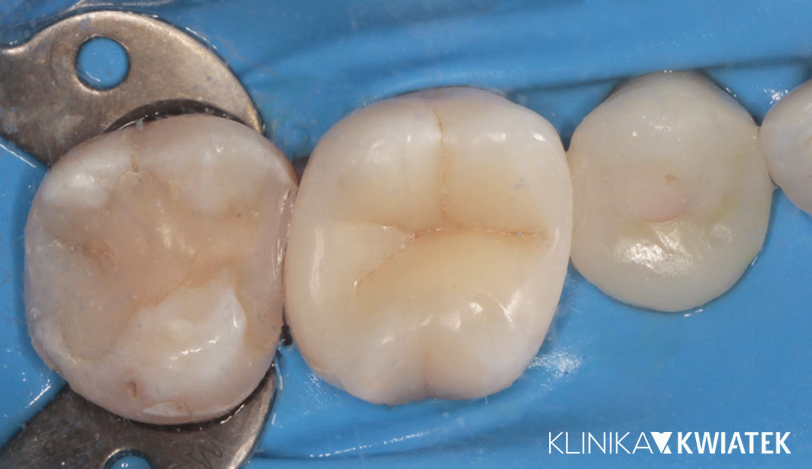Pacjent zgłosił się z rozległym ubytkiem próchnicowym w górnym zębie trzonowym, który po dokładnej diagnostyce zakwalifikowano do leczenia zachowawczego w koferdamie i pod mikroskopem. Precyzyjnie opracowano ubytek, zastosowano leczenie biologiczne oraz wykonano estetyczną odbudowę nanokompozytem. Zabieg przebiegł komfortowo, a Pacjent mógł się w jego trakcie w pełni zrelaksować.
