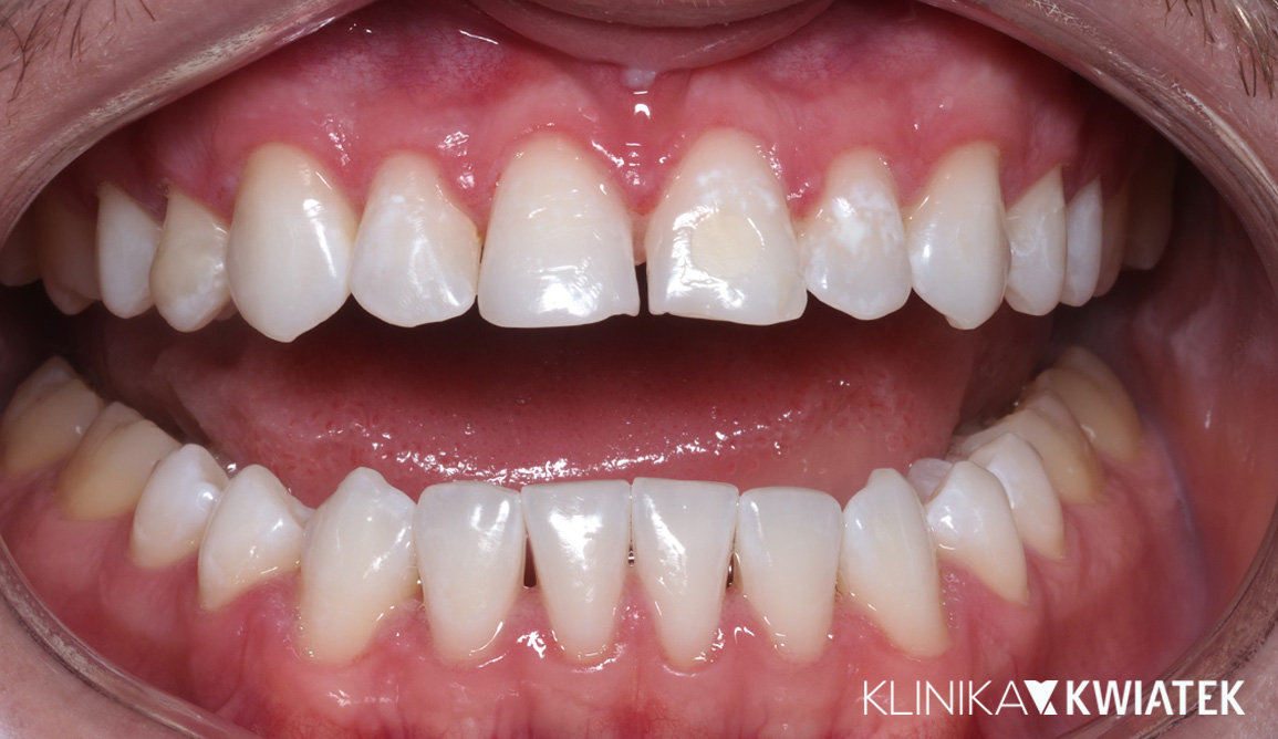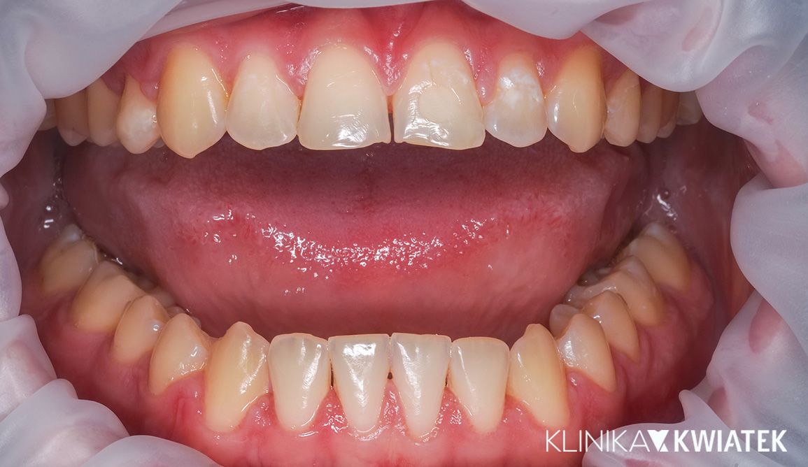 Pan Mateusz zgłosił się do naszej kliniki z nasilonymi starciami powierzchni zębów, licznymi ubytkami próchnicowymi oraz nieprawidłowym zwarciem wynikającym z wieloletniego bruksizmu i zaniedbań higienicznych.