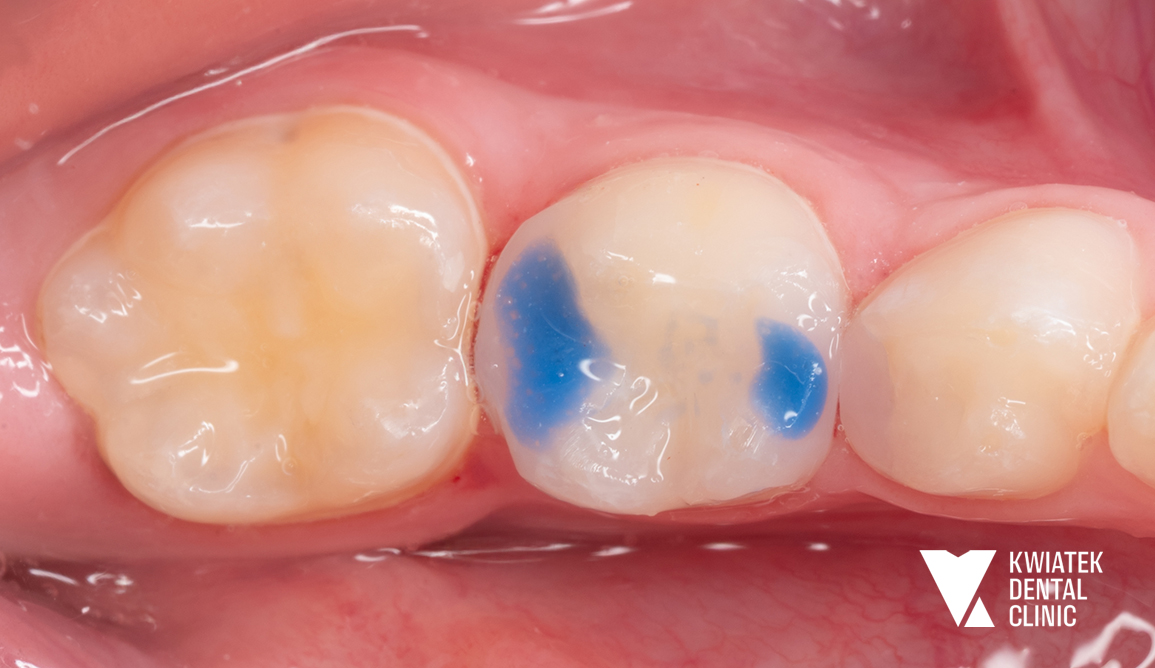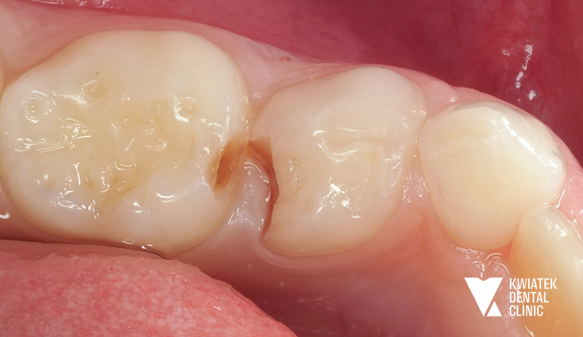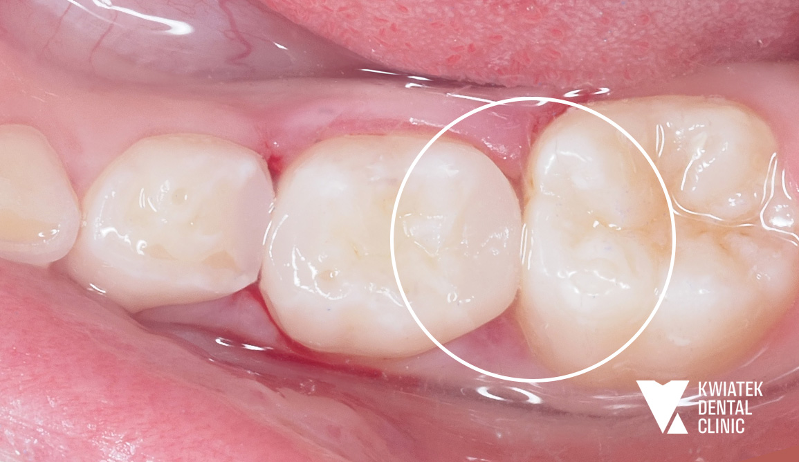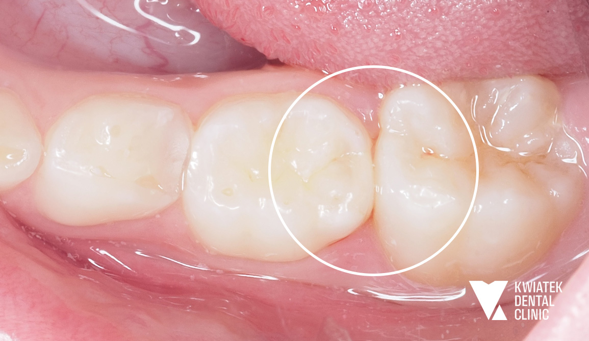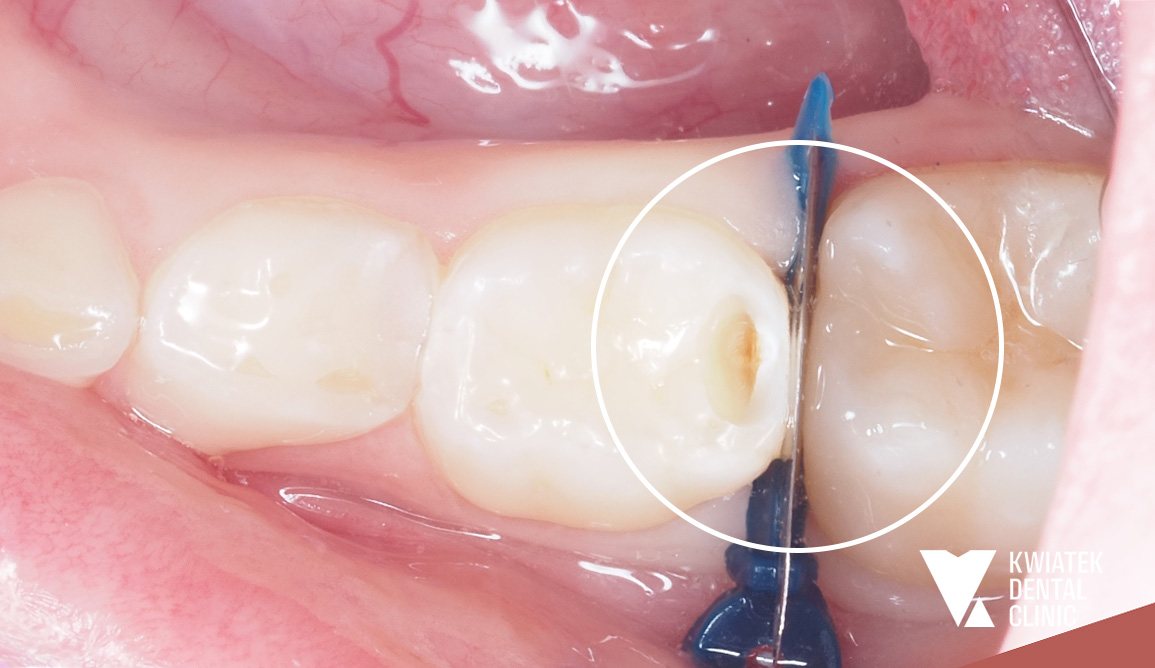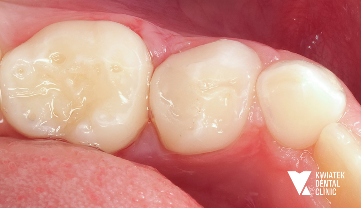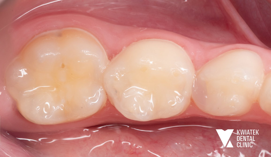 U 9-letniej Pacjentki podczas rutynowej kontroli wykryliśmy głęboką próchnicę w mlecznej piątce. Ząb sąsiadował ze stałą szóstką. W trakcie leczenia okazało się, że proces próchnicowy zaczął obejmować również ząb stały. Na szczęście szybka reakcja pozwoliła zabezpieczyć oba zęby.