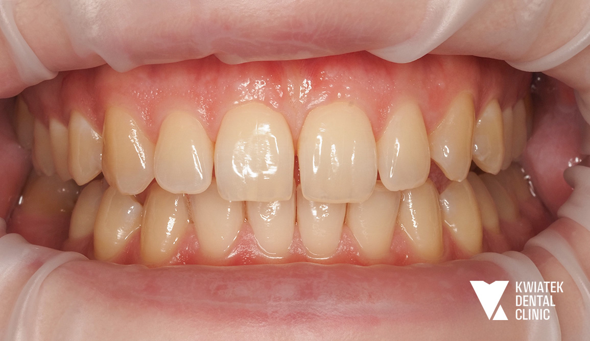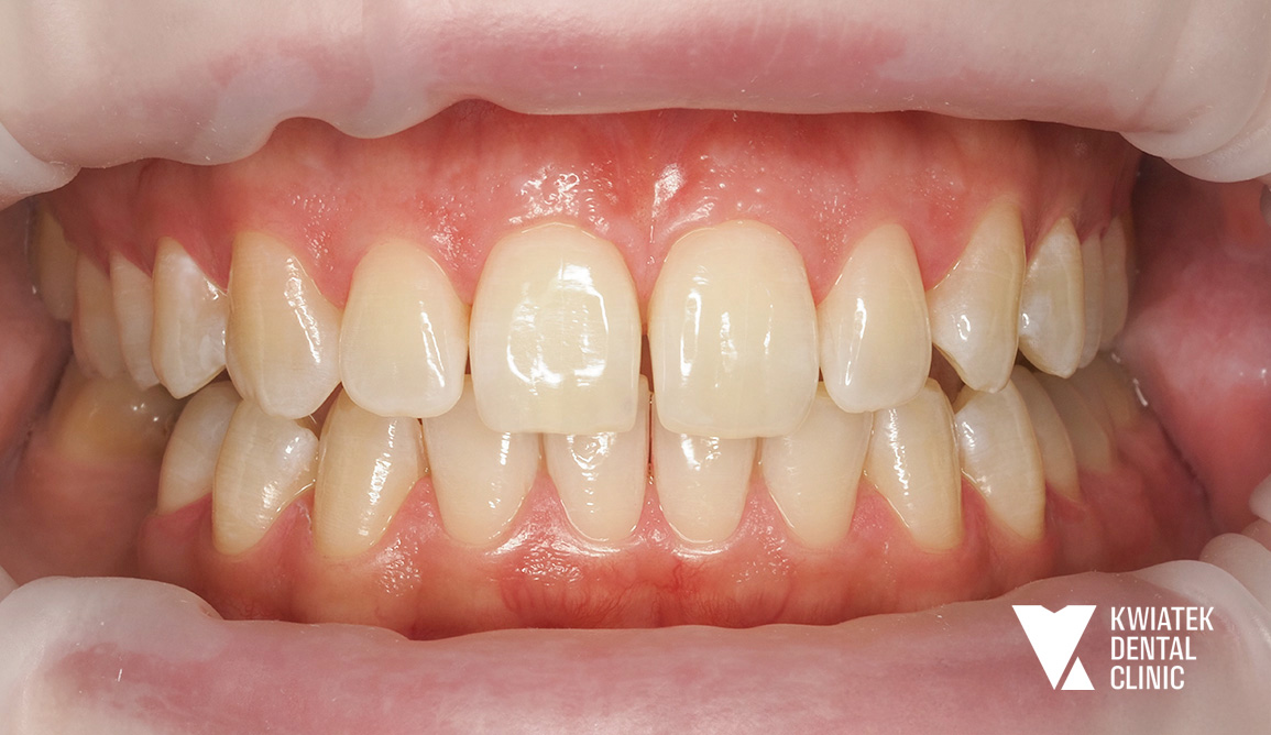 Pacjentka zgłosiła się do kliniki z potrzebą kompleksowej poprawy zarówno funkcji zgryzu, jak i estetyki uśmiechu. W badaniu stwierdzono zgryz krzyżowy, stłoczenia zębów oraz liczne problemy wymagające leczenia zachowawczego i protetycznego, co wymagało wieloetapowego, interdyscyplinarnego podejścia. Terapię poprzedziło staranne przygotowanie jamy ustnej obejmujące ekstrakcję zębów mądrości, profesjonalną higienizację oraz odbudowę osłabionych struktur. Następnie wdrożono zaawansowane leczenie ortodontyczne z wykorzystaniem nowoczesnego systemu nakładkowego. Rezultatem jest harmonijny, stabilny zgryz, idealnie ukształtowane łuki zębowe oraz wyraźnie odmłodzony, jasny uśmiech, podkreślony profesjonalnym wybielaniem.
