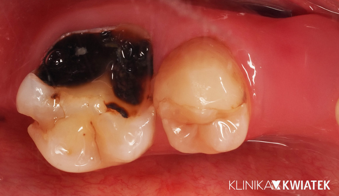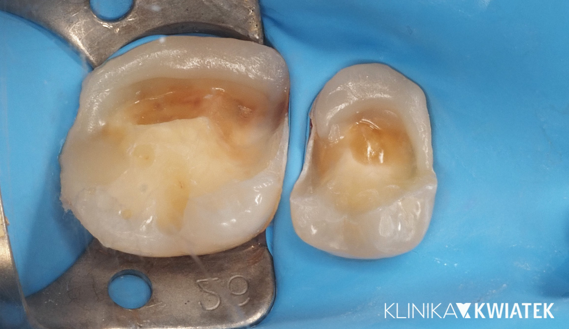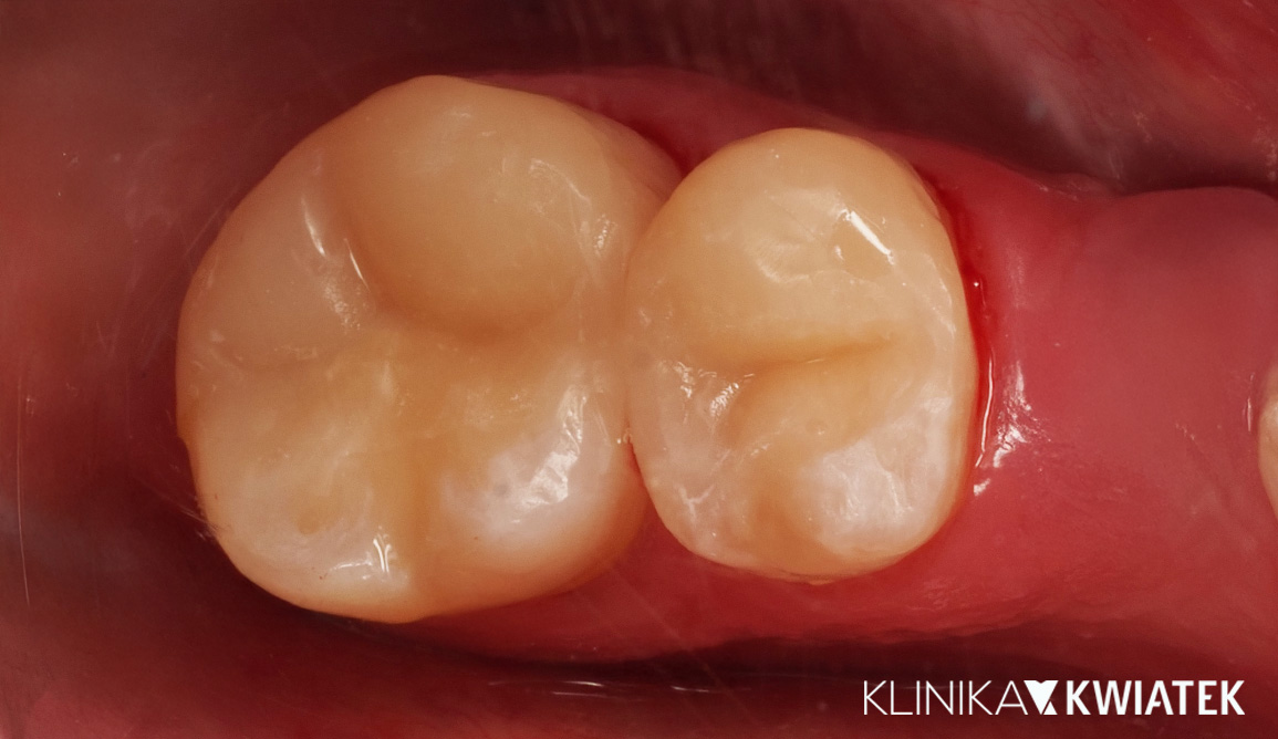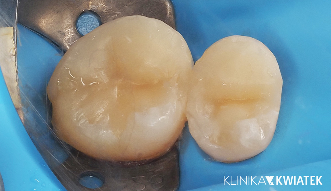 Pacjent zgłosił się z rozległymi ubytkami próchnicowymi zębów bocznych, będącymi częścią szerszego problemu wymagającego etapowego leczenia zachowawczego. Po zakończonym leczeniu biologicznym wykonano precyzyjną odbudowę kompozytową w warunkach pełnej izolacji. Pacjent został poinformowany, że w przyszłości - w zależności od warunków klinicznych - możliwe będzie rozważenie leczenia protetycznego.
