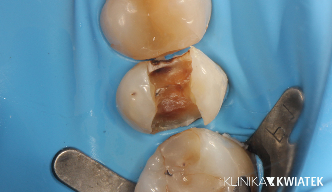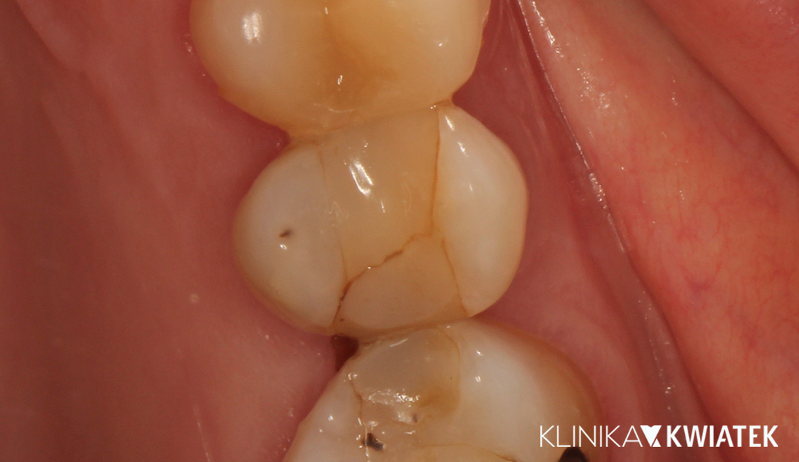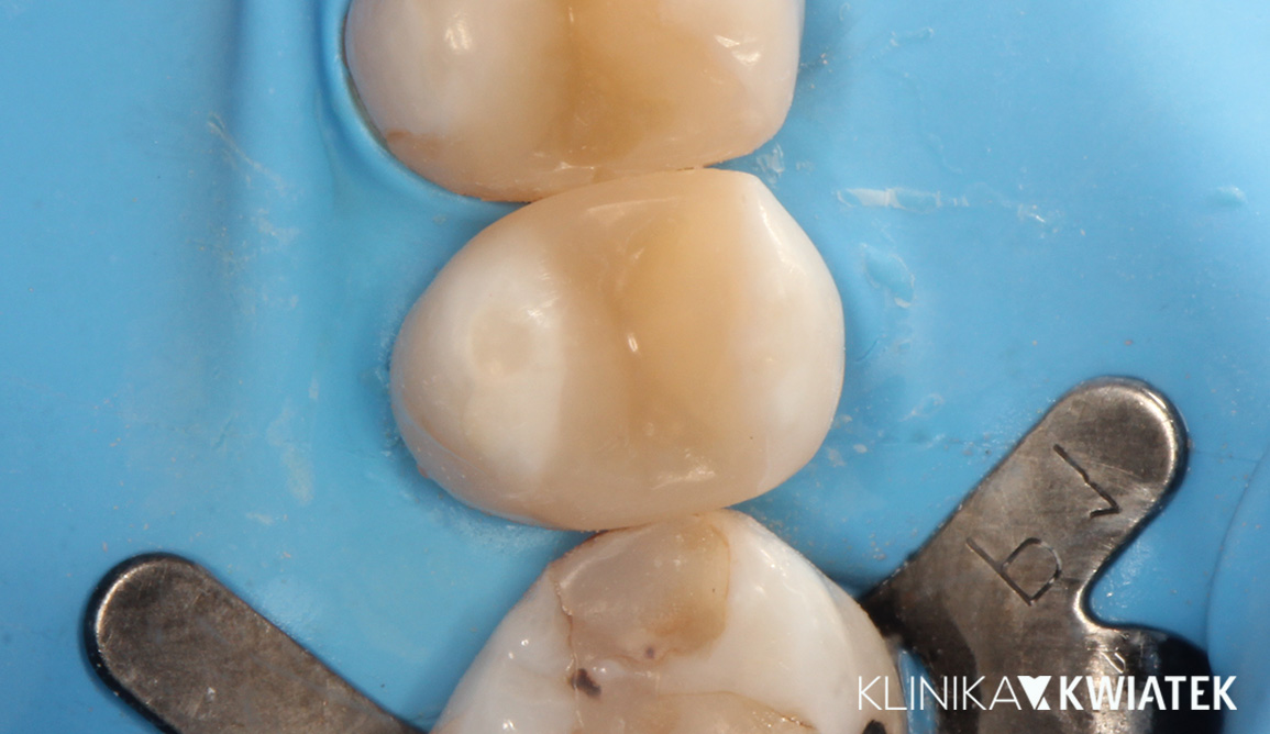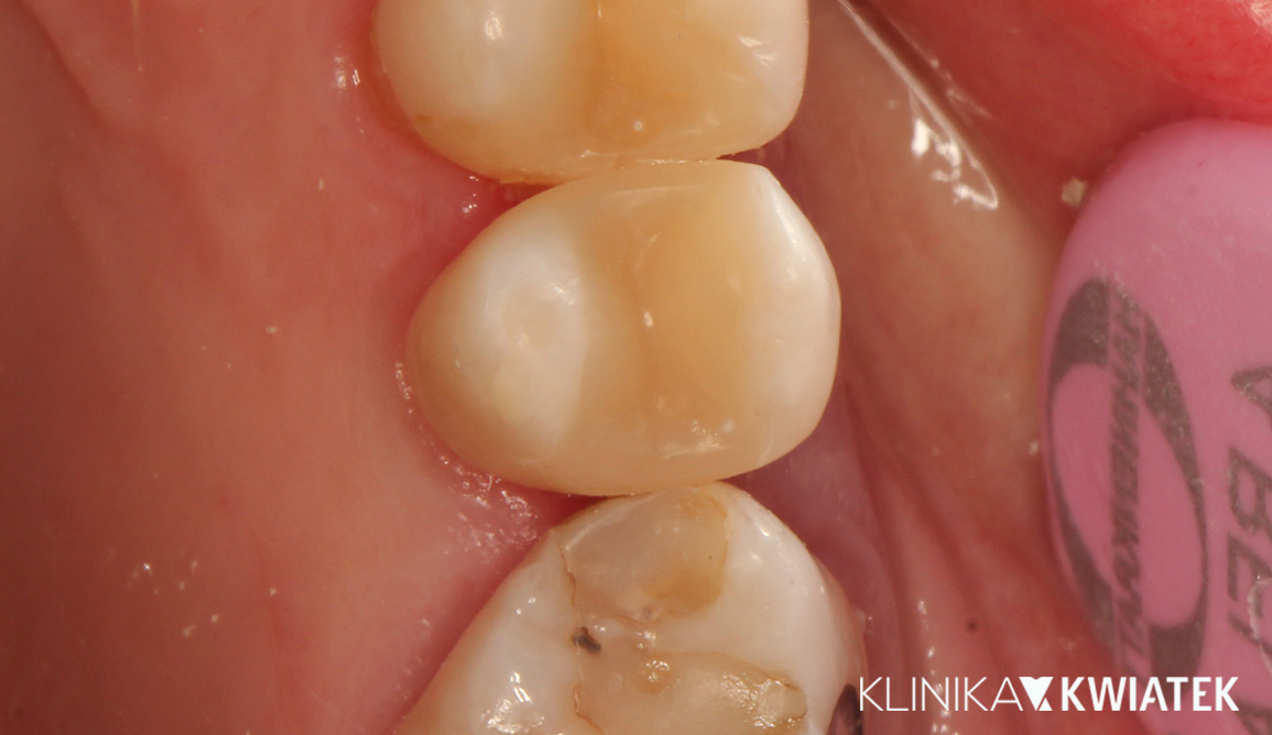 Pacjent zgłosił się z głęboką, wtórną próchnicą w zębie 16 oraz utratą szczelności poprzedniego wypełnienia. W znieczuleniu, z izolacją koferdamem i pracą w powiększeniu wykonano pełne oczyszczenie ubytku oraz jego precyzyjną odbudowę nanokompozytem. Ząb odzyskał prawidłowy kształt, idealny punkt styczny, szczelność i funkcję żucia.